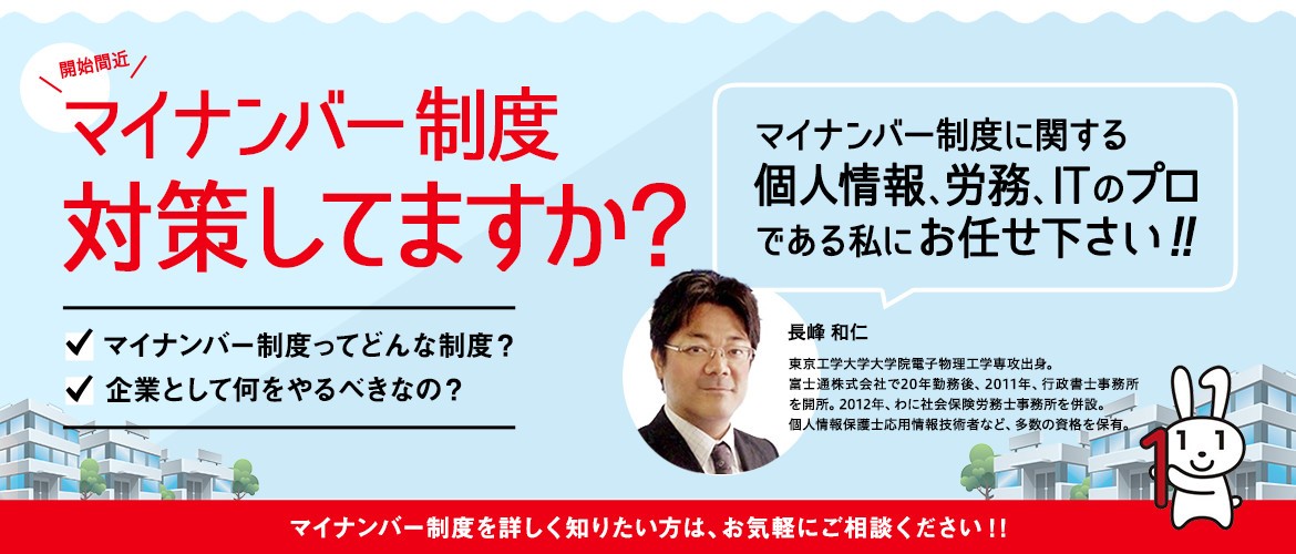 当局では、お客様の社内のマイナンバー対応状況を診断し、問題点や現状に合った対策案を提示いたします。個人情報保護士の資格を持ち、ITにも精通し、企業法務と労務の専門家でもある代表自ら診断をしますので、対応コストも踏まえた漏れのない対策案をご提案します。